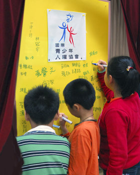 また、12月10日の世界人権デーには、毎年高雄(カオション)で公共イベントや学校でのプレゼンテーションを開催しています。 何百もの生徒たちが世界人権宣言の条項を説明する、即興パフォーマンスに押し寄せます。 例えば、青少年の人権擁護者たちが人権の「差別してはいけません」をお芝居にし、高雄小学校で上演しました。